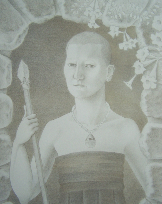 This silverpoint drawing captures the spirit of my sister, Susan, as she battled a serious illness. The cave surrounding her and the details of the spear, the necklace, and the flowers reference her love of the Southwest, cave paintings, and nature.