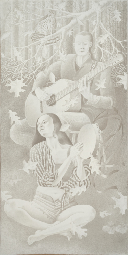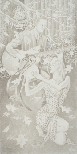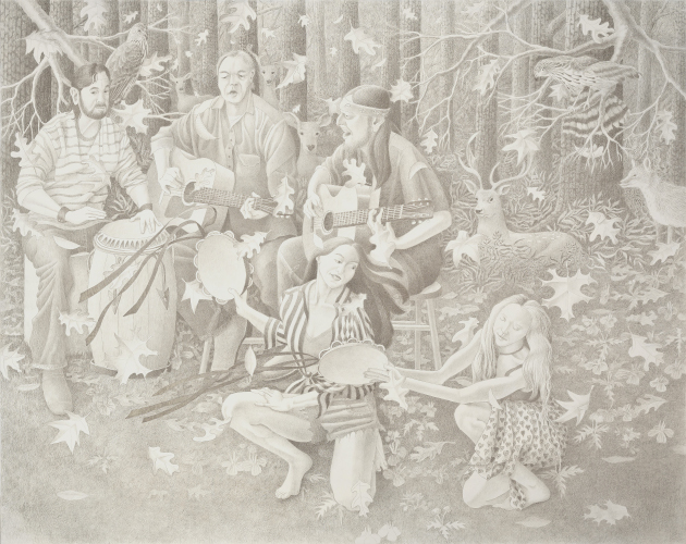 These drawings result from months of work booking and photographing models, investigating flora and fauna, and composing on the drawing table. The three musicians in the center panel are family and friends. All others are professional models who posed in a local art studio. The coopers hawk comes courtesy of a local falconer who allowed me to take close up photos of her bird. The deer posed in my back yard. Everything else--the trees, the ferns and other groundcover, and the falling leaves--is pure imagination.