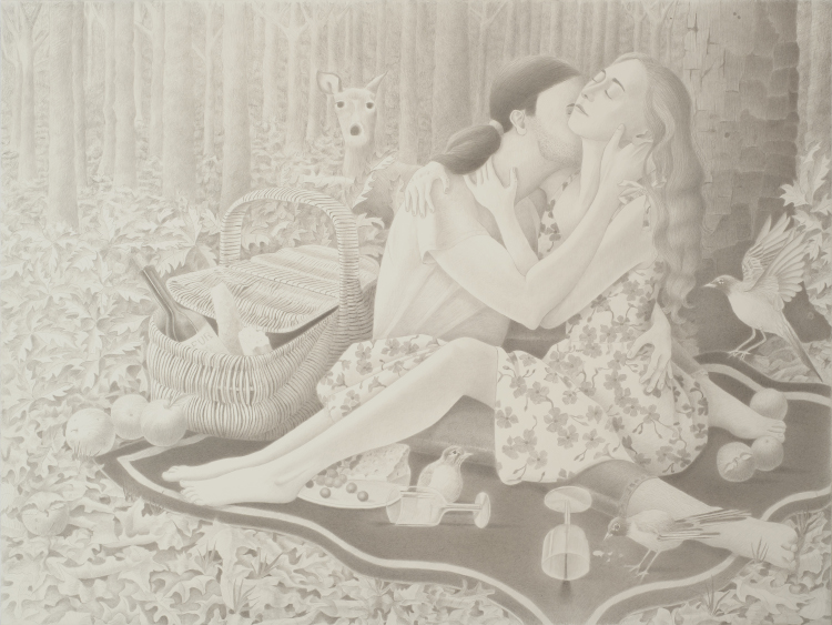 Most of my recent artwork has focused on human interactions with nature. Some of these depict purposeful encounters such as fishing or picking up horseshoe crabs at the beach. Others are more passive interactions. Picnic is one of those -- a young couple on a picnic in the woods enjoying but not necessarily making use of the flora and fauna that surrounds them. I love depicting the life cycles in nature - the decaying carpet of leaves on the forest floor along side the greenery of the fragrant sumac undergrowth. This lacy backdrop is a change from recent, sun-drenched scenes and is particularly suited to the delicate medium of silverpoint. Many thanks to my models, Mia and John.