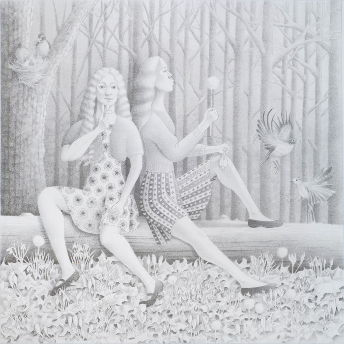 I enjoyed using silverpoint to create the high level of detail in this drawing - the bark of the trees, the leaves and flowers on the floor of the forest, and the patterns and textures of the clothing. Working in sterling silver gives so much pleasure. Applying many layers of silver over many weeks is at once mesmerizing and gratifying.