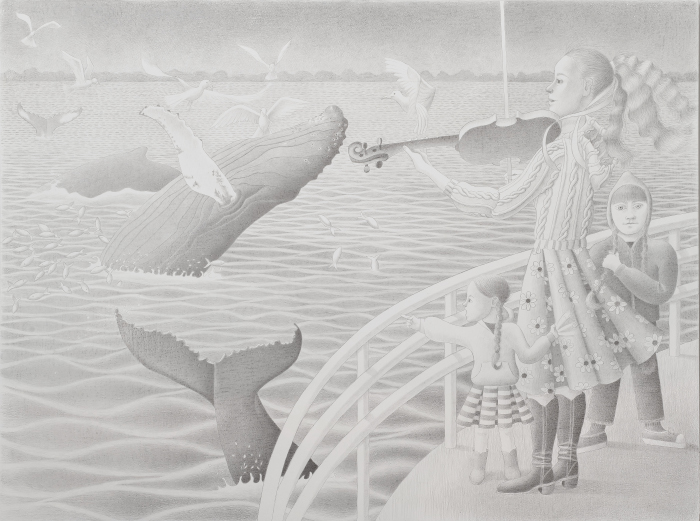 This is one of my most joyous works to date and it was a joy to create. I have always wanted to see whales up close but was never able to go on a whale watching trip. Lo and behold, during the spring and summer of 2020, during the most stringent social distancing, the whales came to me. For the past few years they have been regular visitors to the Jersey coast. I especially thank the accomplished wildlife photographer and conservationist, Don Riepe, for providing some photographs of breaching whales - they just didn't cooperate on my trip.