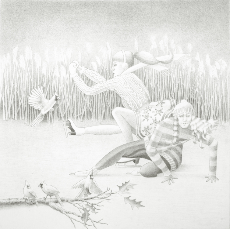 This silverpoint drawing is the precursor of an egg tempera painting of the same size, part of my "Four Seasons" series. Here I've drawn on images recalled from skating on a nearby lake known as Poricy Pond but frequently called Foo Lake by the locals.