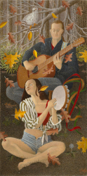 These paintings are created using egg tempera on true gesso panels. Each consists of layers and layers of marks, alternating layers of opaque and translucent paint. The many layers creates the luminosity that is unique to egg tempera. Each painting takes three to four months to complete, not including the drawing and design phase. Here is a 2-minute video about my technique.