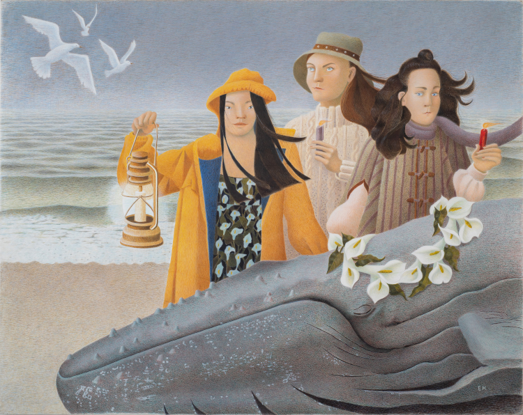 The idea for Lamentation first appeared in a vision in my mind--as do many of my works. The year before I had spent several months working on a joyous depiction of whales cavorting in nearshore waters. There is a sad side of this nearshore behavior. I worked in the marine conservation field for many years and followed the work of the Marine Mammal Stranding Center in New Jersey. Friends and family posed for the mourning women. My original vision pictured the scene from a greater distance. It took me a while to decide on the scale. My final composition allowed for enough detail in the figures while still showing the relative size of the whale. This is large for an egg tempera painting and took six months to complete.