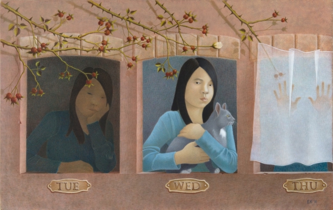 In this painting I was thinking about notions dealing with our perception of the passage of time, especially the years when we pass from childhood to young adulthood as best I could remember. I recall at that age that the divisions between days were more concrete as though we flipped off the "living" switch overnight, and turned it back on when the sun rose again. My niece and her kitten posed for this work. It was the largest egg tempera piece I had done to date and gave me an arena in which I could push the medium further than before, taking full advantage of egg tempera's ability to render both opaque and translucent matter.