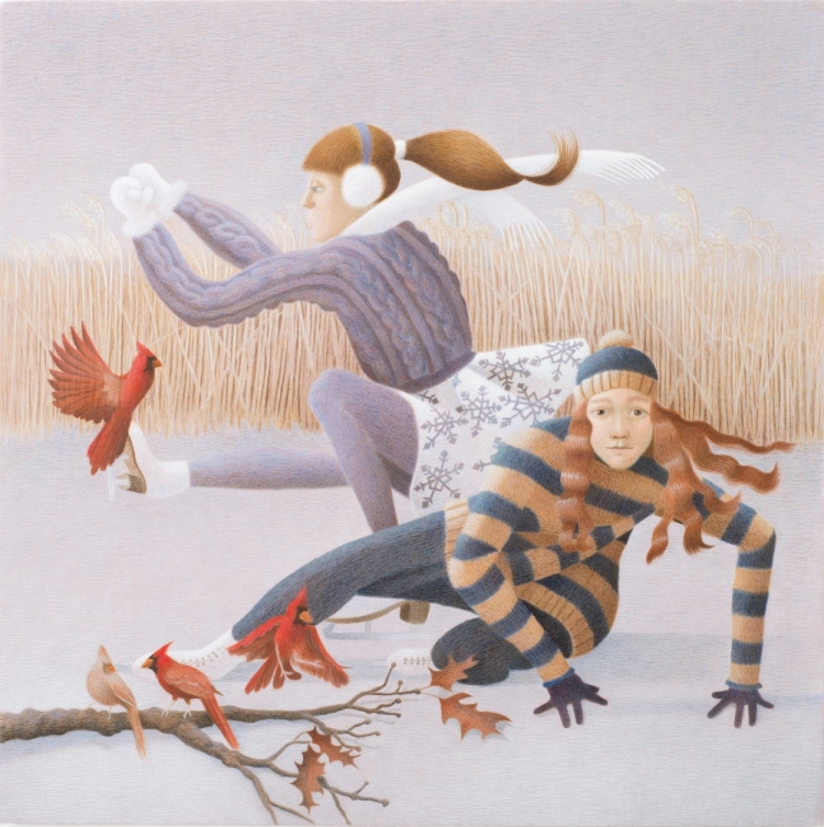 Living in coastal New Jersey, I enjoy the rich tableau of flora and fauna offered by the four very distinct seasons. This winter scene is the seconed in a series depicting the four seasons. It looks back to the years of fun we had skating on a small lake near my house. After school, we'd drop our books, grab our skates and head for Foo Lake (known to outsiders as Poricy Pond). Located in Middletown, just north of Red Bank, the pond fed a small creek that ran into the Navesink River. In those days, kids learned to play hockey and other games outdoors with little or no adult supervision. In the 21st century, these waters rarely freeze well enough for skating.