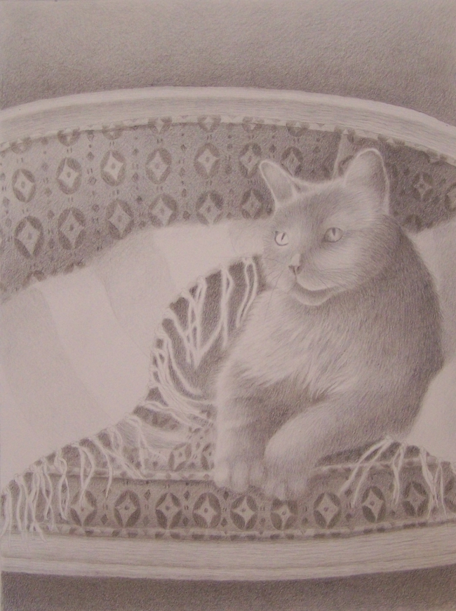 I worked on this portrait of my catShadow by lantern light in the evenings following Hurricane Sandy. Each night we would curl up by the fireplace and get to work. I am so glad that I did this when I did because less than 6 months later, my companion of 17 years passed away suddenly. I later used the drawing to create an egg tempera painting. The time spent on that work made it seem as if he was still with me.