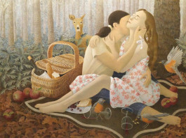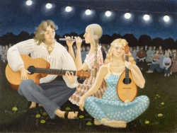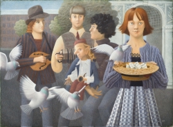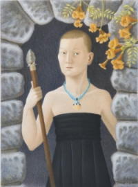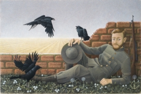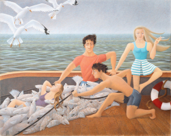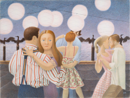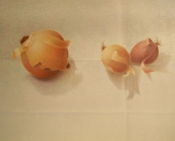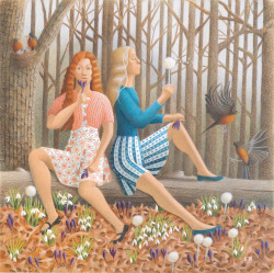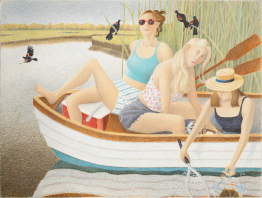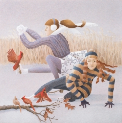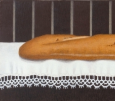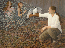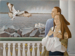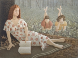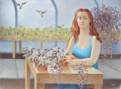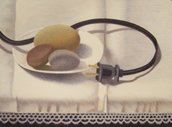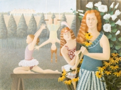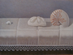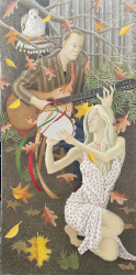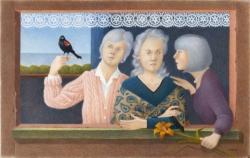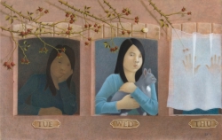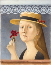 These paintings are created using egg tempera on true gesso panels. Each consists of layers and layers of marks, alternating layers of opaque and translucent paint. The many layers creates the luminosity that is unique to egg tempera. Each painting takes three to four months to complete, not including the drawing and design phase. Here is a 2-minute video about my technique.